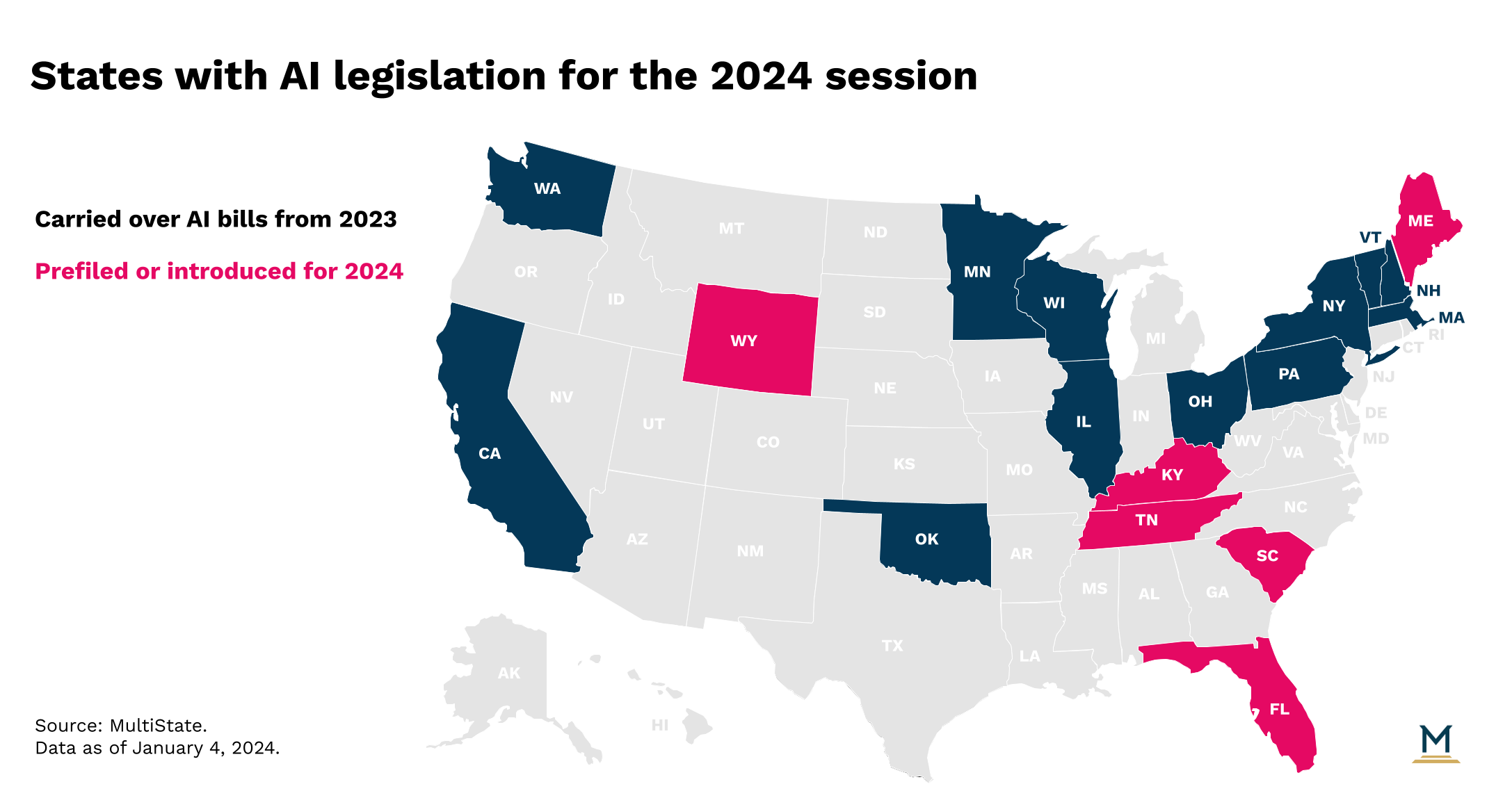 The arrival of generative AI tools last year brought incredible possibilities but it also raised concerns about the potential impact of the new technology. The public and experts think regulations will be necessary. And policymakers have vowed to take quick regulatory action to ensure they will not fall behind the rapidly accelerating technology as they did with data privacy regulation. What can we expect from state AI policy in 2024?
