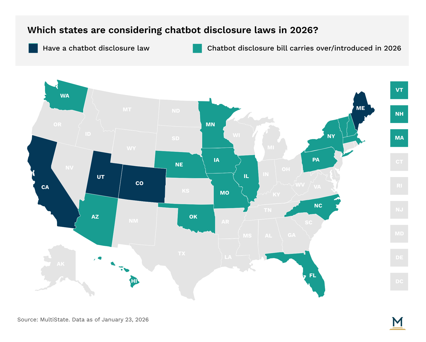 Chatbot disclosure requirements are expanding, with states such as Utah, California, Colorado, and Maine enacting or amending laws to ensure users know when they are interacting with AI rather than a human.